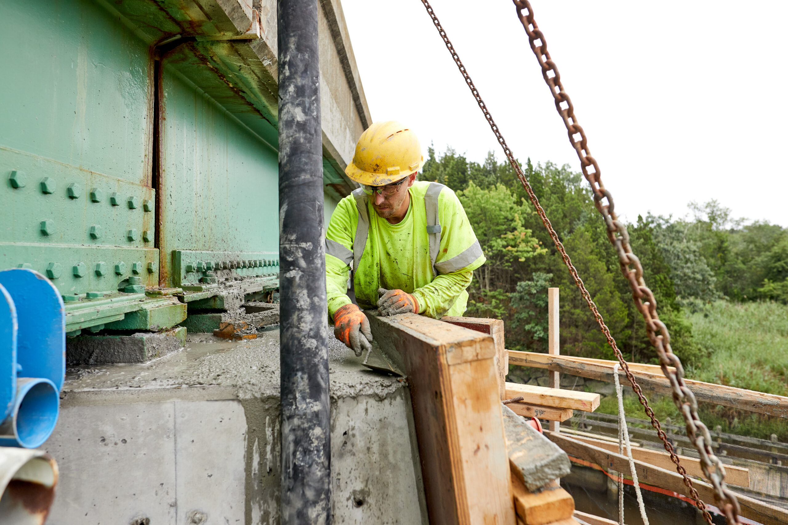 One of the most technically demanding aspects of the project was the placement of 188 cubic yards of concrete into forms located beneath the bridge.