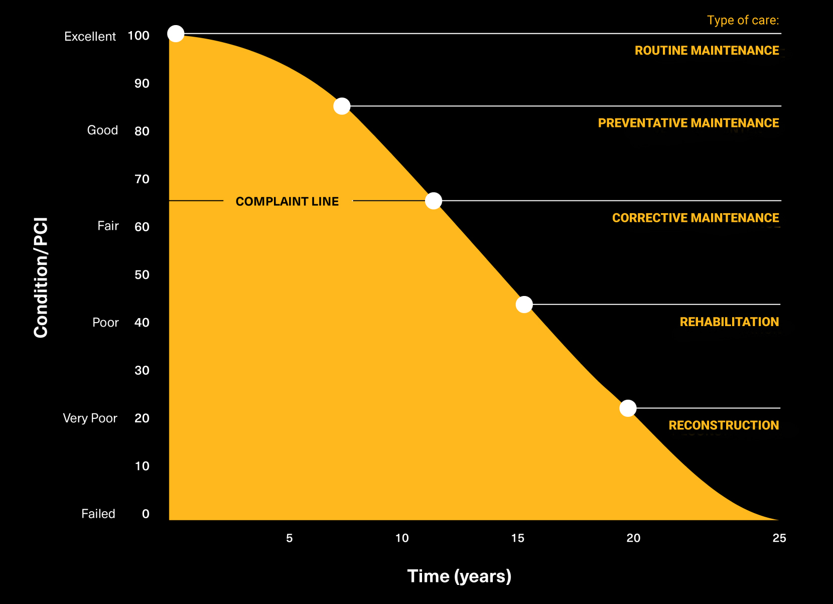 Explore each spot on the asphalt deterioration curve to see which treatment can have the greatest impact.To learn more about our process, click each treatment.